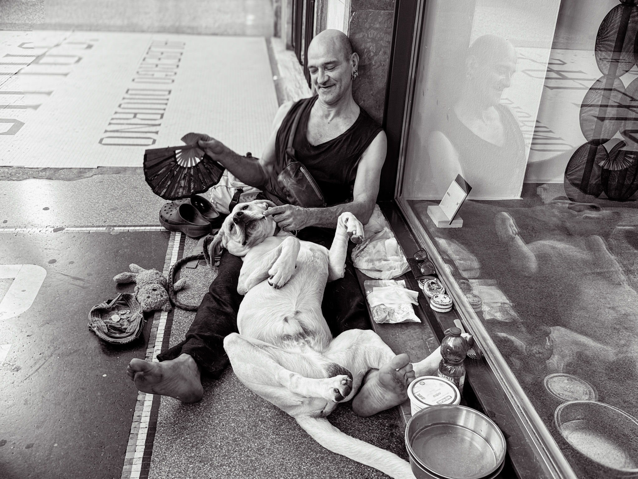 Und wie ich so wei­ter­ging, sah ich plötz­lich von Wei­tem ei­nen Fä­cher, der sich be­weg­te. Er ge­hör­te ei­nem Mann, der vor ei­nem ele­gan­ten Schau­fens­ter lag. Er fä­cher­te nicht sich, es war sein Hund, dem er zärt­lich Küh­lung zu­we­del­te. Das gros­se Tier lag ent­spannt auf dem Rü­cken, halb auf dem Schoß sei­nes Lieb­ha­bers, der ihn karessierte.